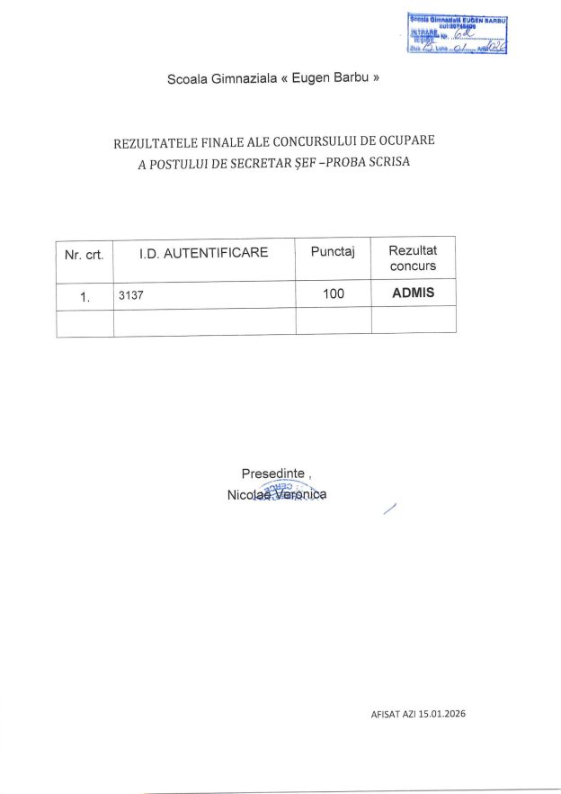 Școala Gimnazială ”Eugen Barbu” cu sediul în localitatea București, strada I.P.Pavlov, nr 2-4, Sectorul 1, în conformitate cu HG. nr 1336/28.10.2022 pentru aprobarea Regulamentului cadru privind organizarea si dezvoltarea carierei personalului contractual din sectorul bugetar platit din fonduri publice, O.U.G. nr. 156/30.12.2024 privind unele masuri fiscal-bugetare in domeniul cheltuielilor publice si O.U.G. nr. 12/ 13.03.2025 privind acordarea unui sprijin financiar pentru unele categorii de pensionar, a organizat PROBA SCRISĂ la concursul pentru ocuparea postului de: