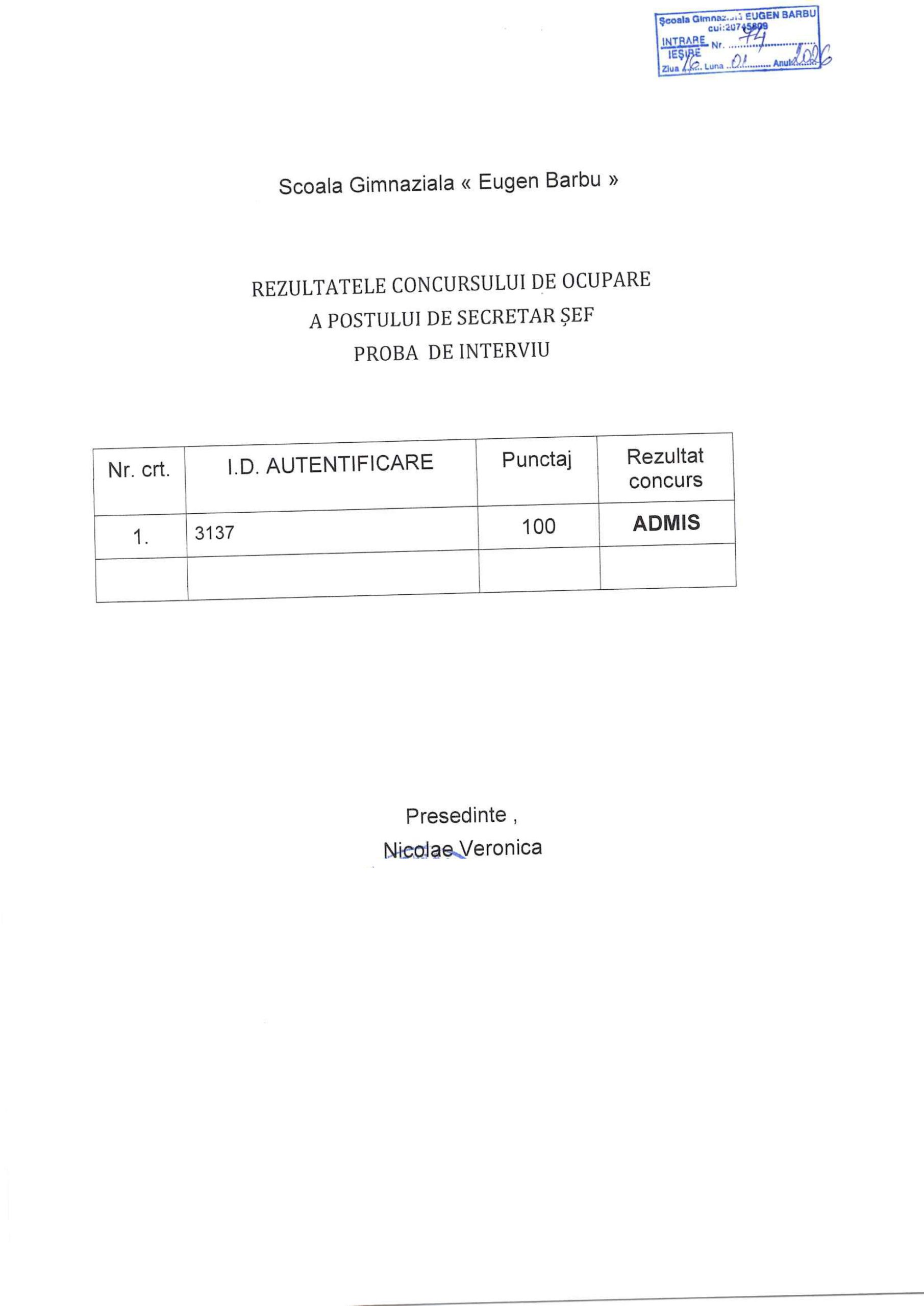 Școala Gimnazială ”Eugen Barbu” cu sediul în localitatea București, strada I.P.Pavlov, nr 2-4, Sectorul 1, în conformitate cu HG. nr 1336/28.10.2022 pentru aprobarea Regulamentului cadru privind organizarea si dezvoltarea carierei personalului contractual din sectorul bugetar platit din fonduri publice, O.U.G. nr. 156/30.12.2024 privind unele masuri fiscal-bugetare in domeniul cheltuielilor publice si O.U.G. nr. 12/ 13.03.2025 privind acordarea unui sprijin financiar pentru unele categorii de pensionar, a organizat PROBA INTERVIU la concursul pentru ocuparea postului de: