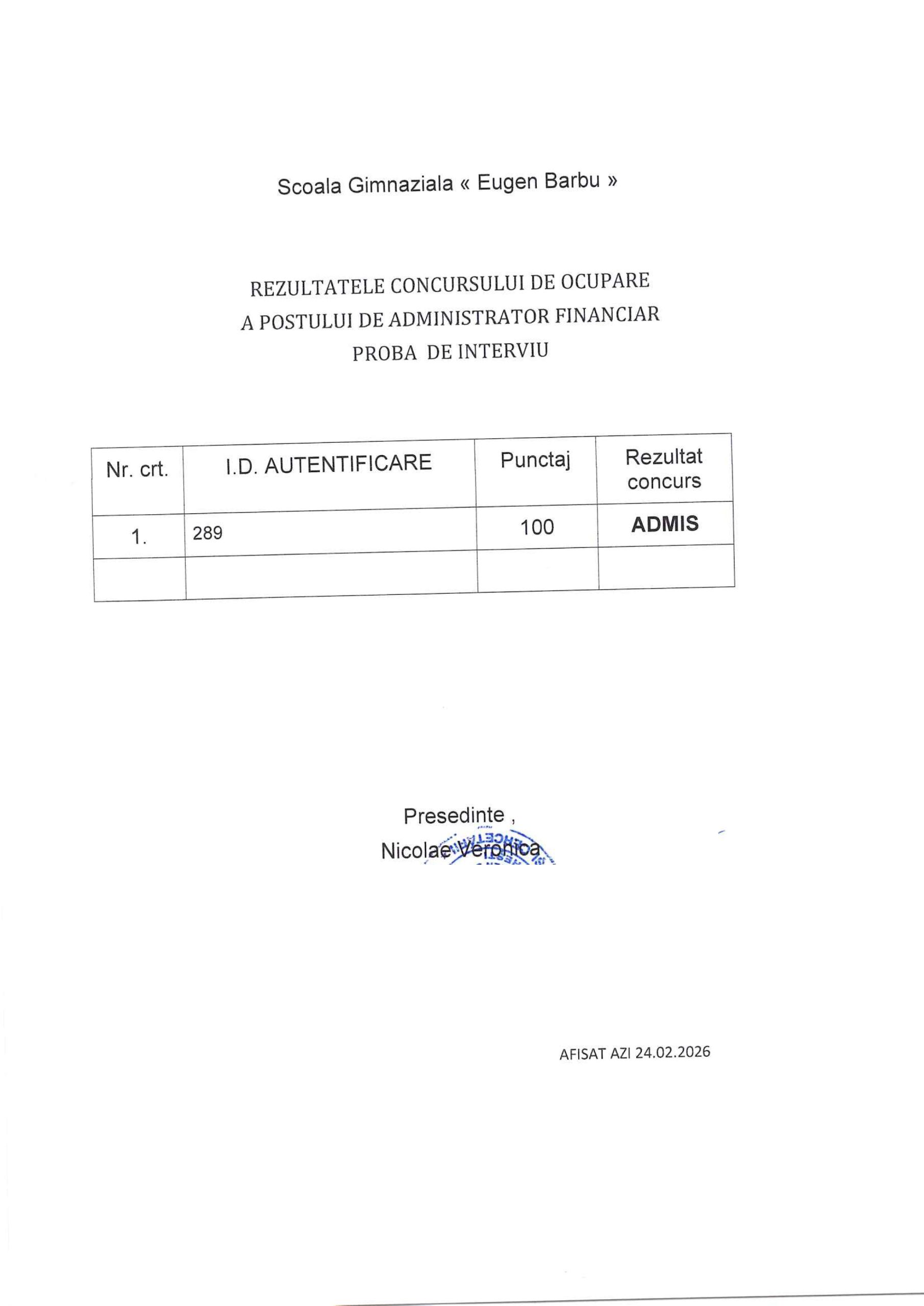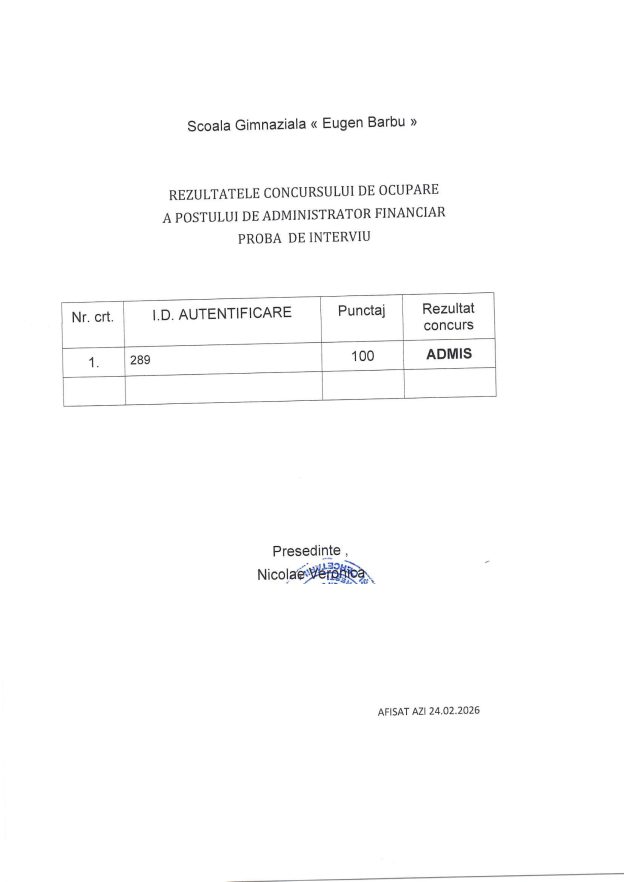 Şcoala Gimnazială ,,Eugen Barbu” cu sediul in localitatea Bucuresti, strada I.P.Pavlov, nr 2-4, Sectorul 1 in conformitate cu H.G. nr 1336/28.10.2022 pentru aprobarea Regulamentului cadru privind organizarea si dezvoltarea carierei personalului contractual din sectorul bugetar plătit din fonduri publice, O.U.G. nr. 156/30.12.2024 privind unele măsuri fiscal- bugetare în domeniul cheltuielilor publice și O.U.G. nr. 12/13.03.2025 privind acordarea unui sprijin financiar pentru unele categorii de pensionari în anul 2025, organizează concurs pentru ocuparea postului temporar vacant de: ADMINISTRATOR FINANCIAR