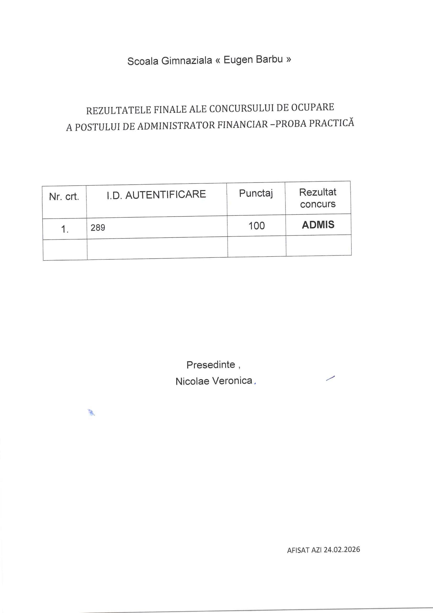 REZULTATELE PROBA PRACTICĂ PENTRU CONCURSUL DE OCUPARE A POSTULUI TEMPORAR VACANT DE ADMINISTRATOR FINANCIAR: