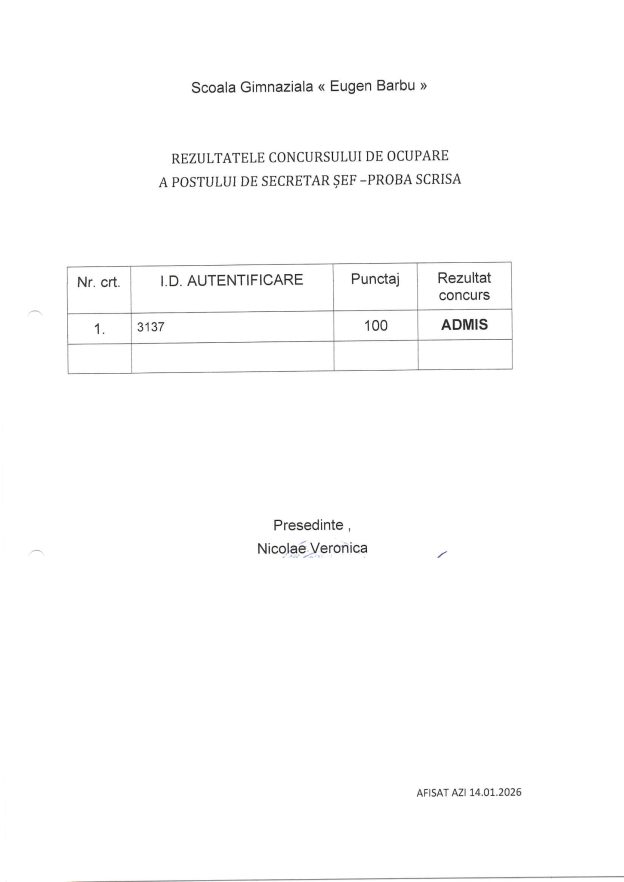 Școala Gimnazială ”Eugen Barbu” cu sediul în localitatea București, strada I.P.Pavlov, nr 2-4, Sectorul 1, în conformitate cu HG. nr 1336/28.10.2022 pentru aprobarea Regulamentului cadru privind organizarea si dezvoltarea carierei personalului contractual din sectorul bugetar platit din fonduri publice, O.U.G. nr. 156/30.12.2024 privind unele masuri fiscal-bugetare in domeniul cheltuielilor publice si O.U.G. nr. 12/ 13.03.2025 privind acordarea unui sprijin financiar pentru unele categorii de pensionar, a organizat PROBA SCRISĂ la concursul pentru ocuparea postului de:
