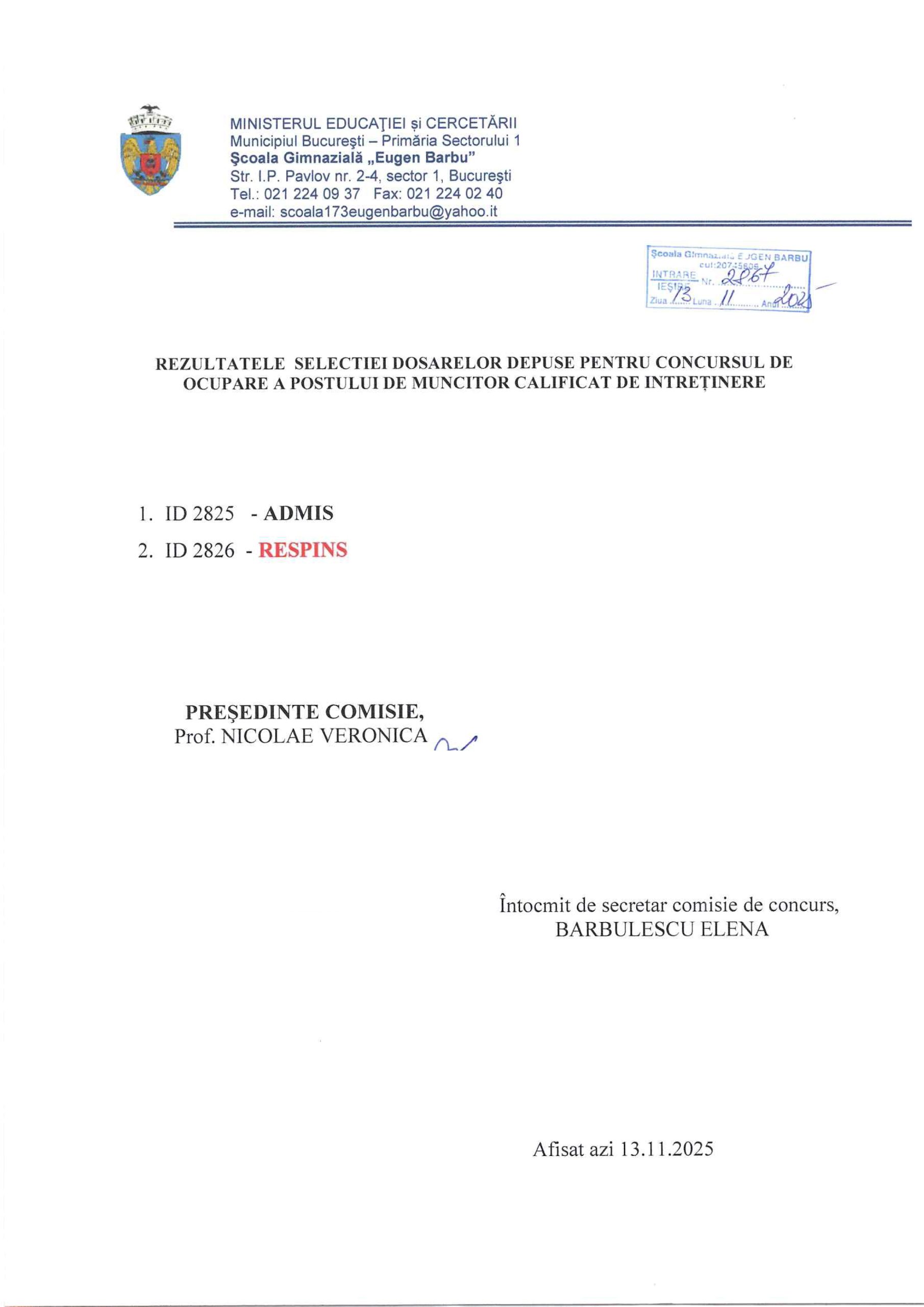 Rezultatele selecției dosarelor depuse pentru concursul de ocupare a postului de Muncitor calificat de întreținere.
