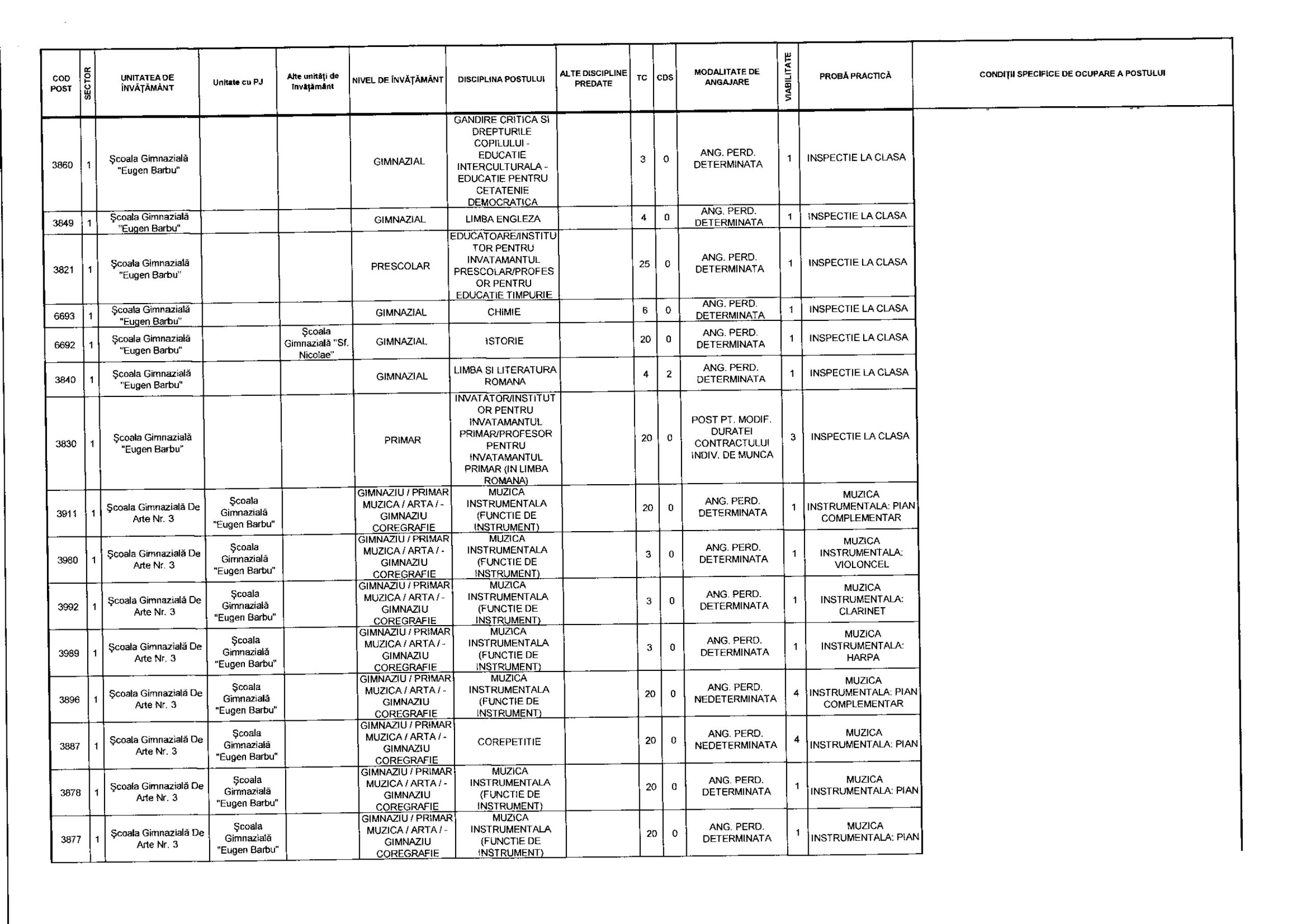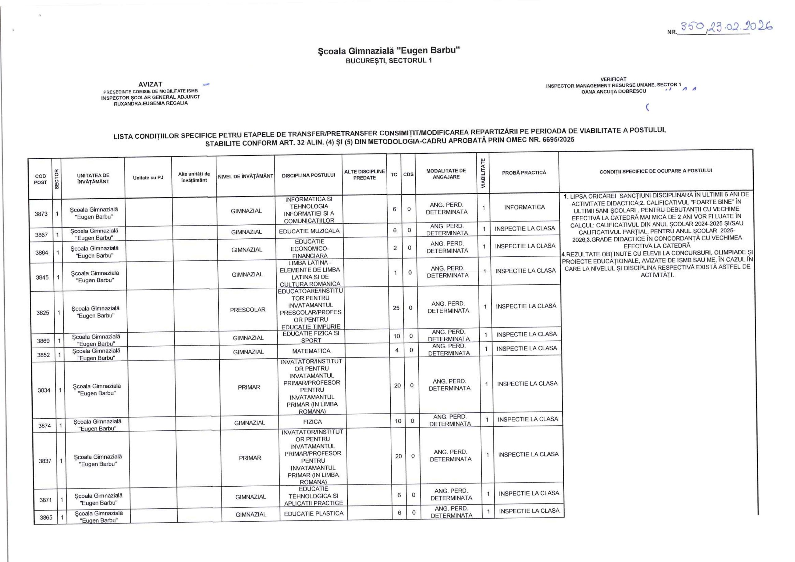 LISTA CONDIȚIILOR SPECIFICE PETRU ETAPELE DE TRANSFER/PRETRANSFER CONSIMITIT/MODIFICAREA REPARTIZARII PE PERIOADA DE VIABILITATE A POSTULUI, STABILITE CONFORM ART. 32 ALIN. (4) $I (5) DIN METODOLOGIA-CADRU APROBATA PRIN OMEC NR. 6695/2025.