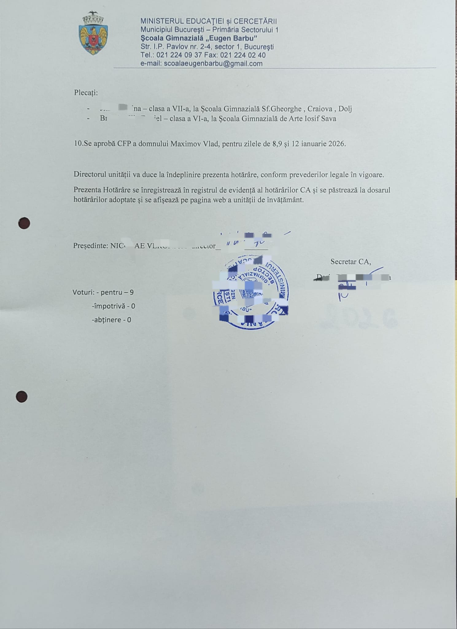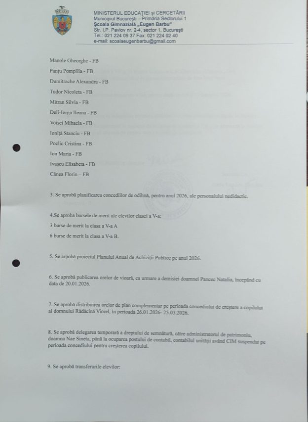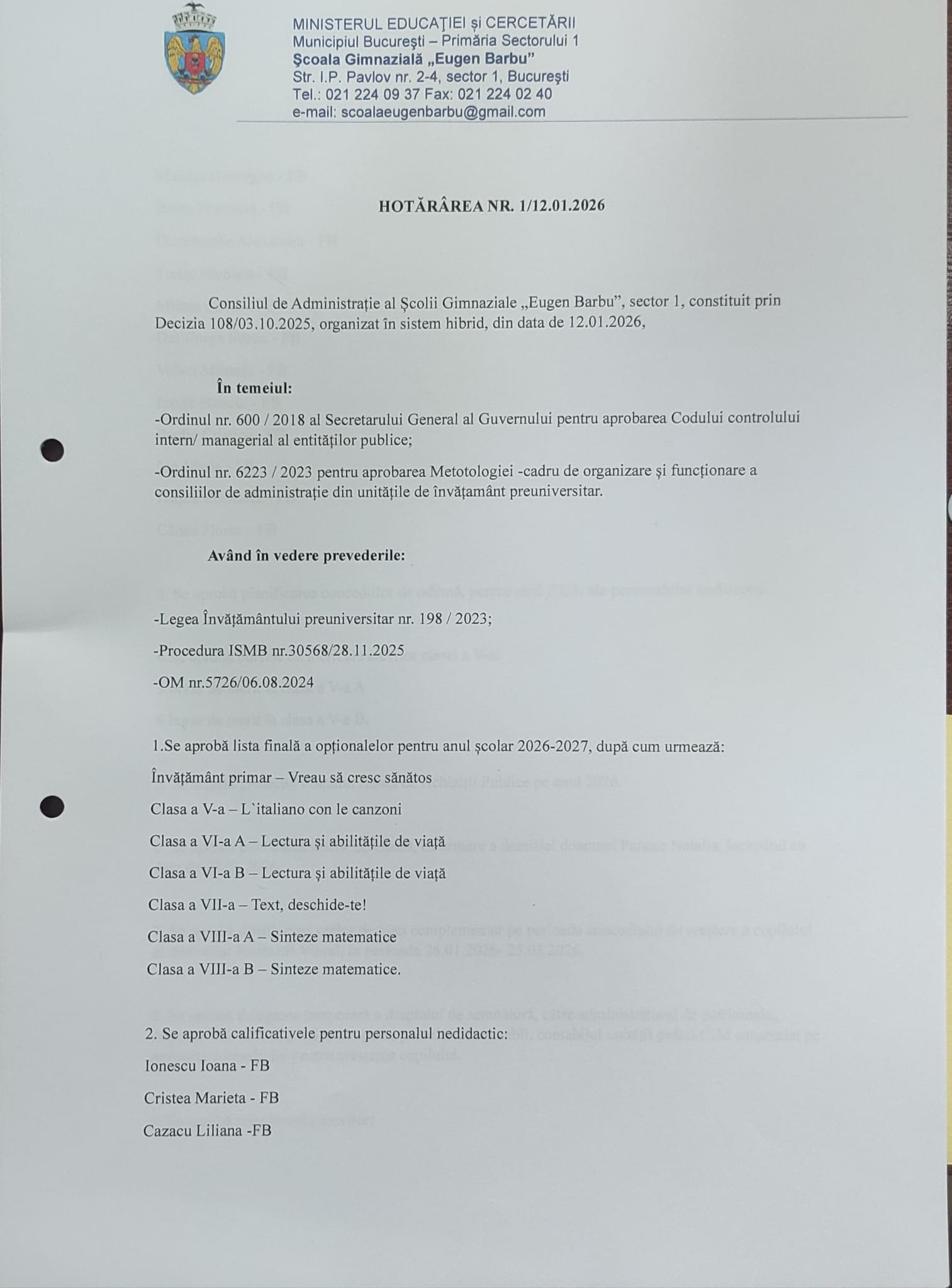 HOTARÂREA NR. 1/12.02.2026 Consiliul de Administrație al Școlii Gimnaziale ”Eugen Barbu”, sector 1, constituit prin Decizia nr. 108/03.10.2025, organizat în sistem hibrid, din data de 12.01.2026,