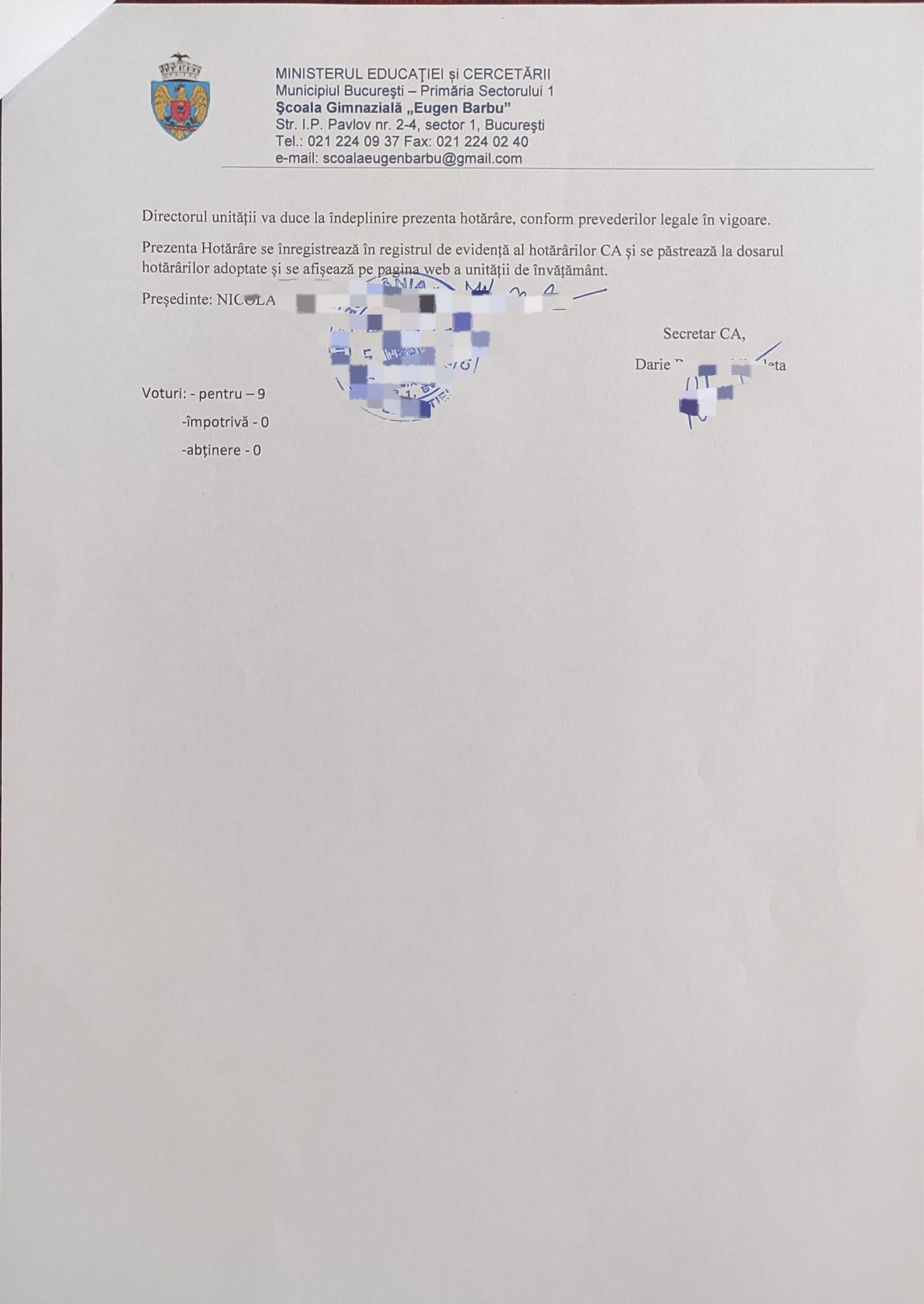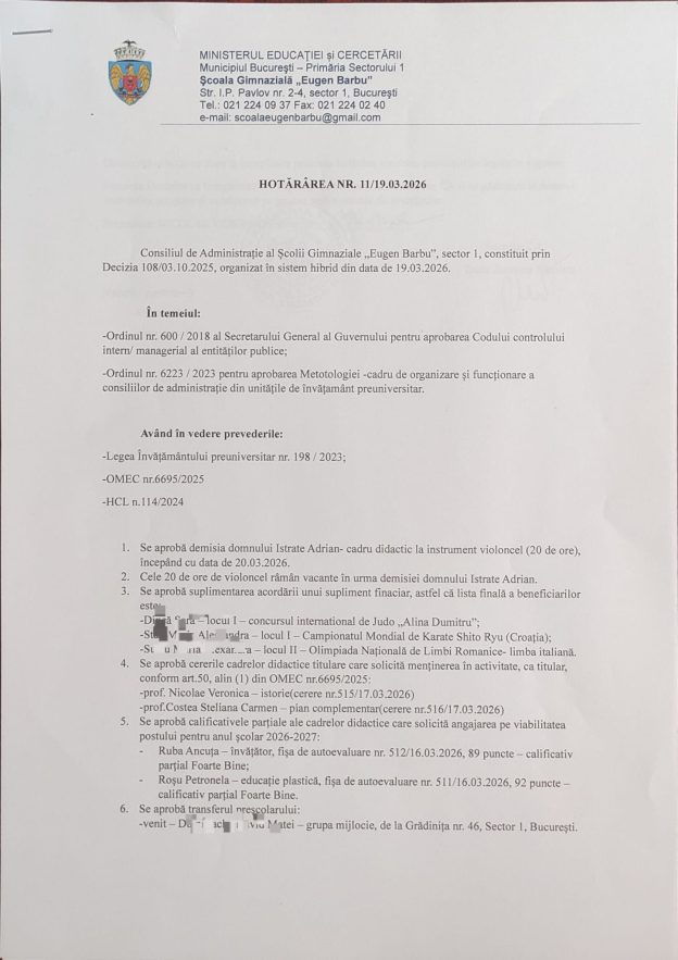 HOTARÂREA NR. 11/19.03.2026 Consiliul de Administrație al Școlii Gimnaziale ”Eugen Barbu”, sector 1, constituit prin Decizia nr. 108/03.10.2025, organizat în sistem hibrid, din data de 19.03.2026,