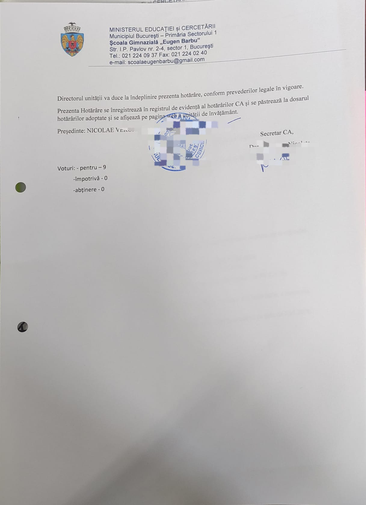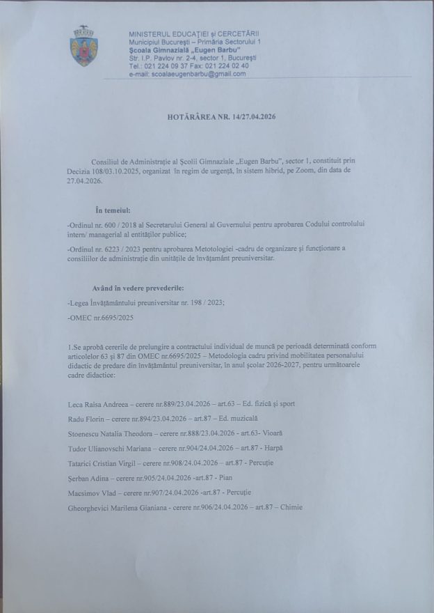 HOTARÂREA NR. 14/27.04.2026 Consiliul de Administrație al Școlii Gimnaziale ”Eugen Barbu”, sector 1, constituit prin Decizia nr. 108/03.10.2025, organizat în regim de urgență, defășurat în sistem hibrid, pe Zoom, din data de 27.04.2026,