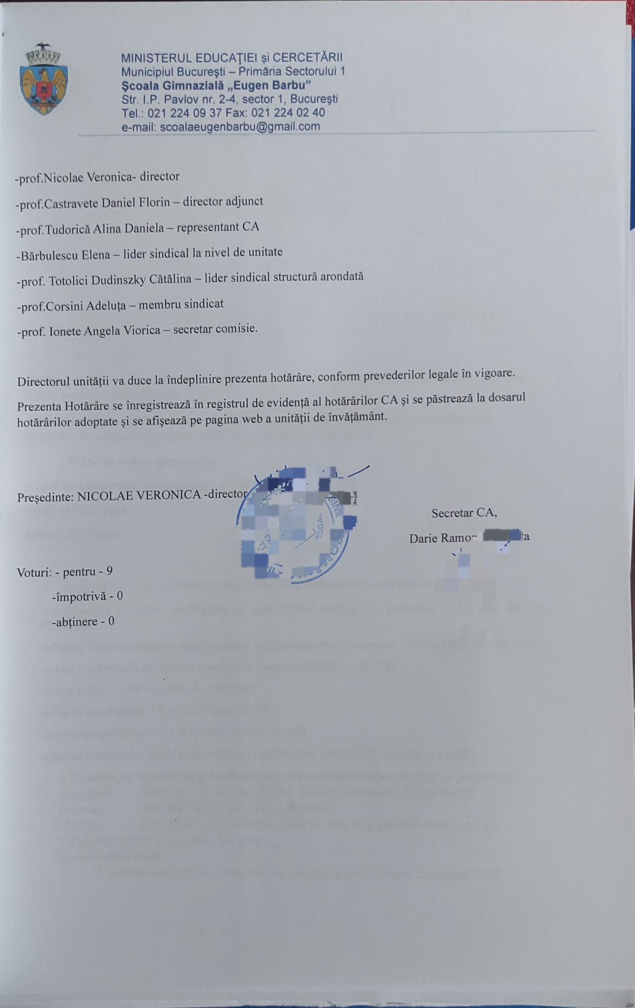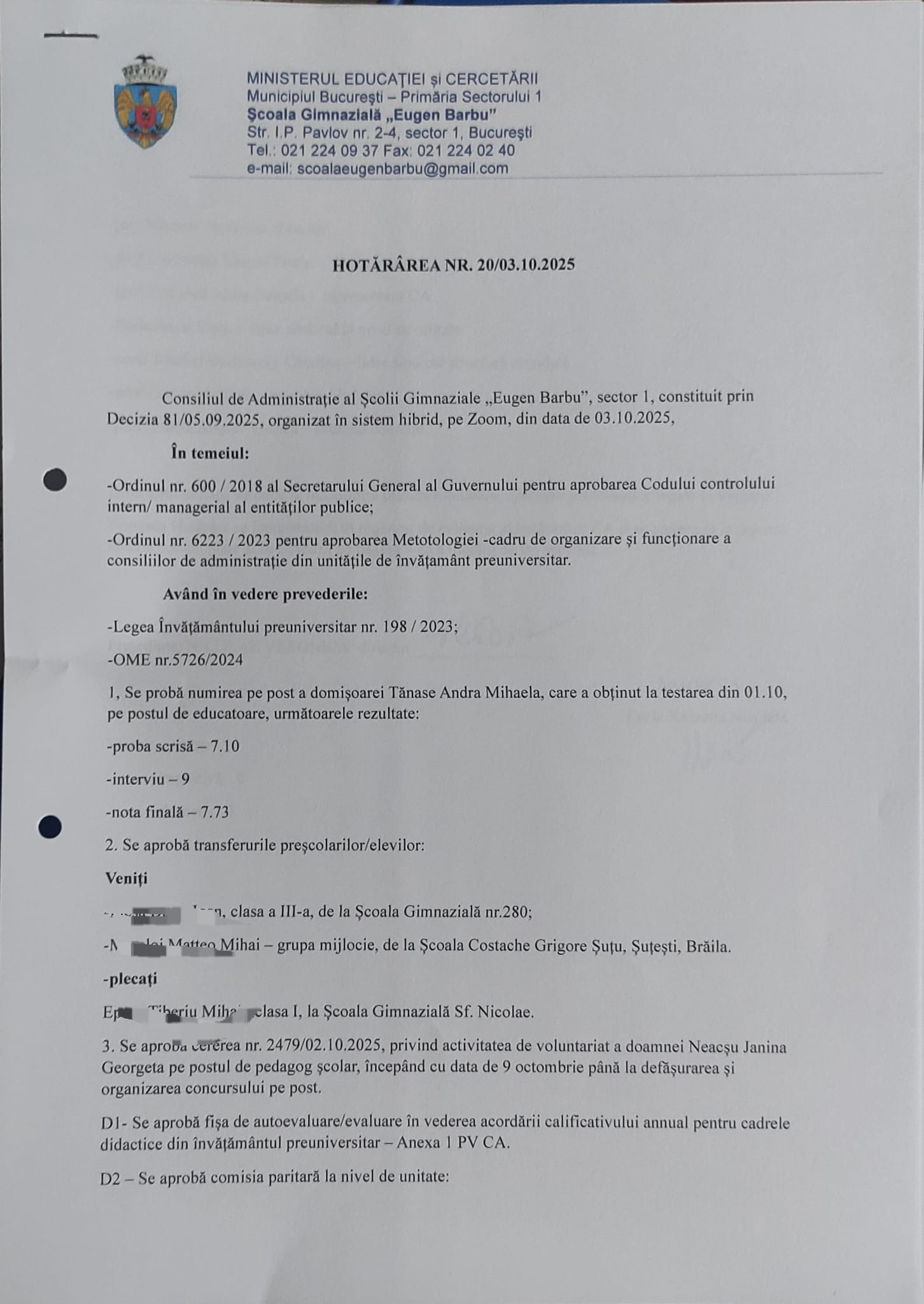 HOTARÂREA NR. 20/03.10.2025 Consiliul de Administrație al Școlii Gimnaziale ”Eugen Barbu”, sector 1, constituit prin Decizia nr. 81/05.09.2025, organizat prin sistem hibrid, pe Zoom, din data de 03.10.2025,