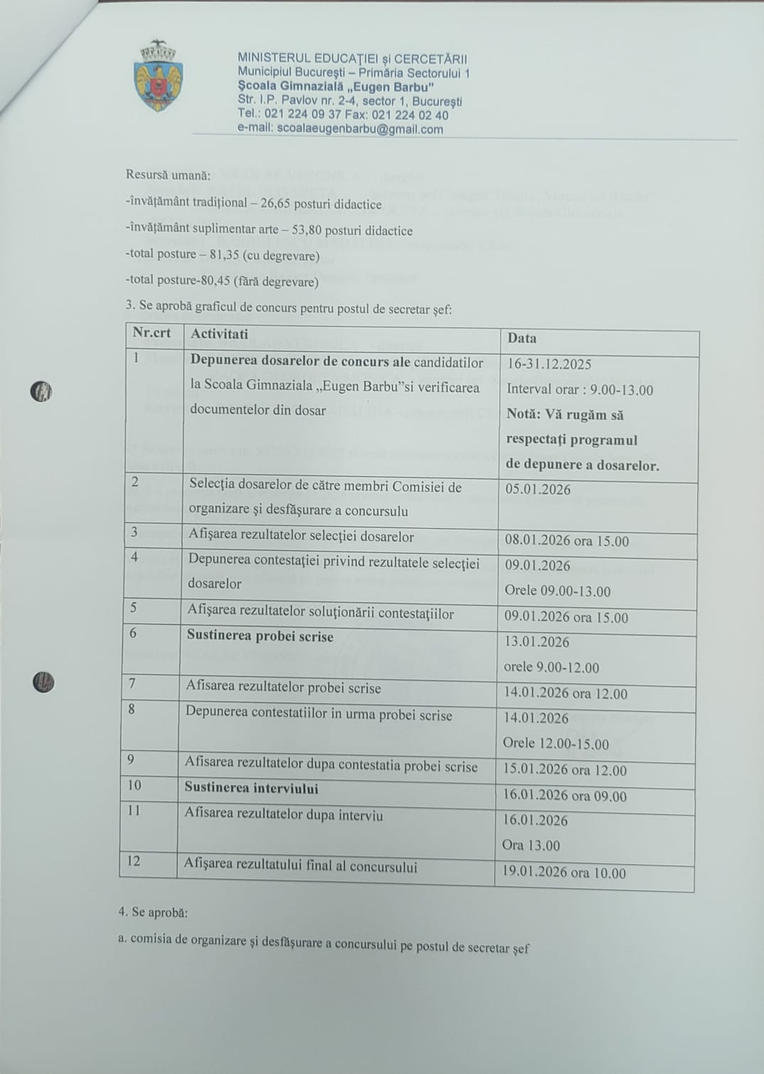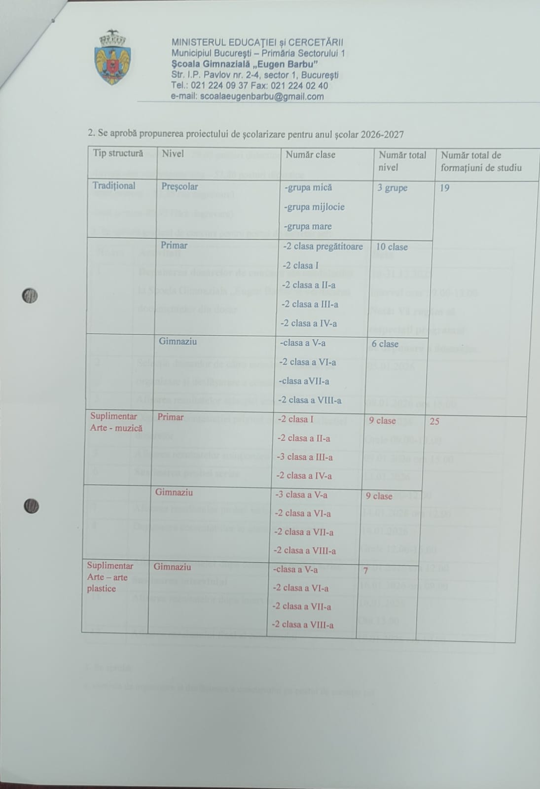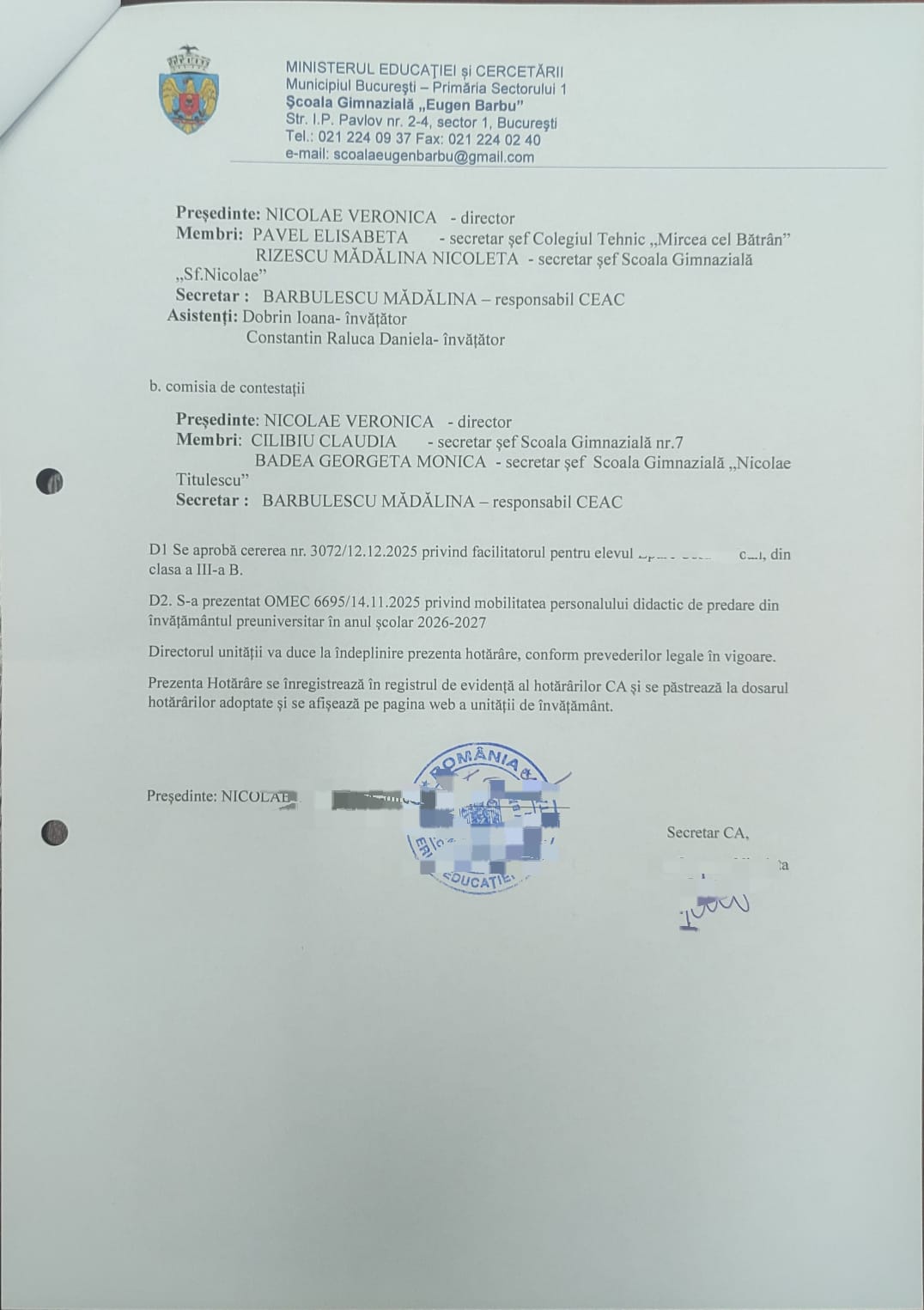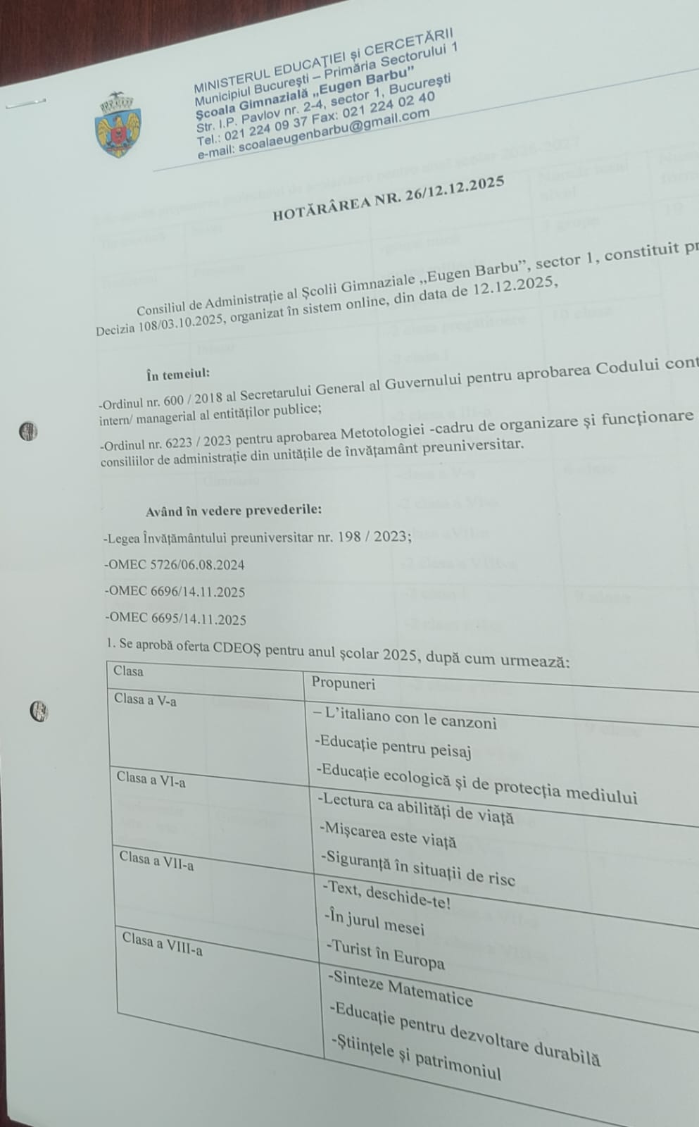 HOTARÂREA NR. 26/12.12.2025 Consiliul de Administrație al Școlii Gimnaziale ”Eugen Barbu”, sector 1, constituit prin Decizia nr. 108/03.10.2025, organizat în sistem online, din data de 12.12.2025,