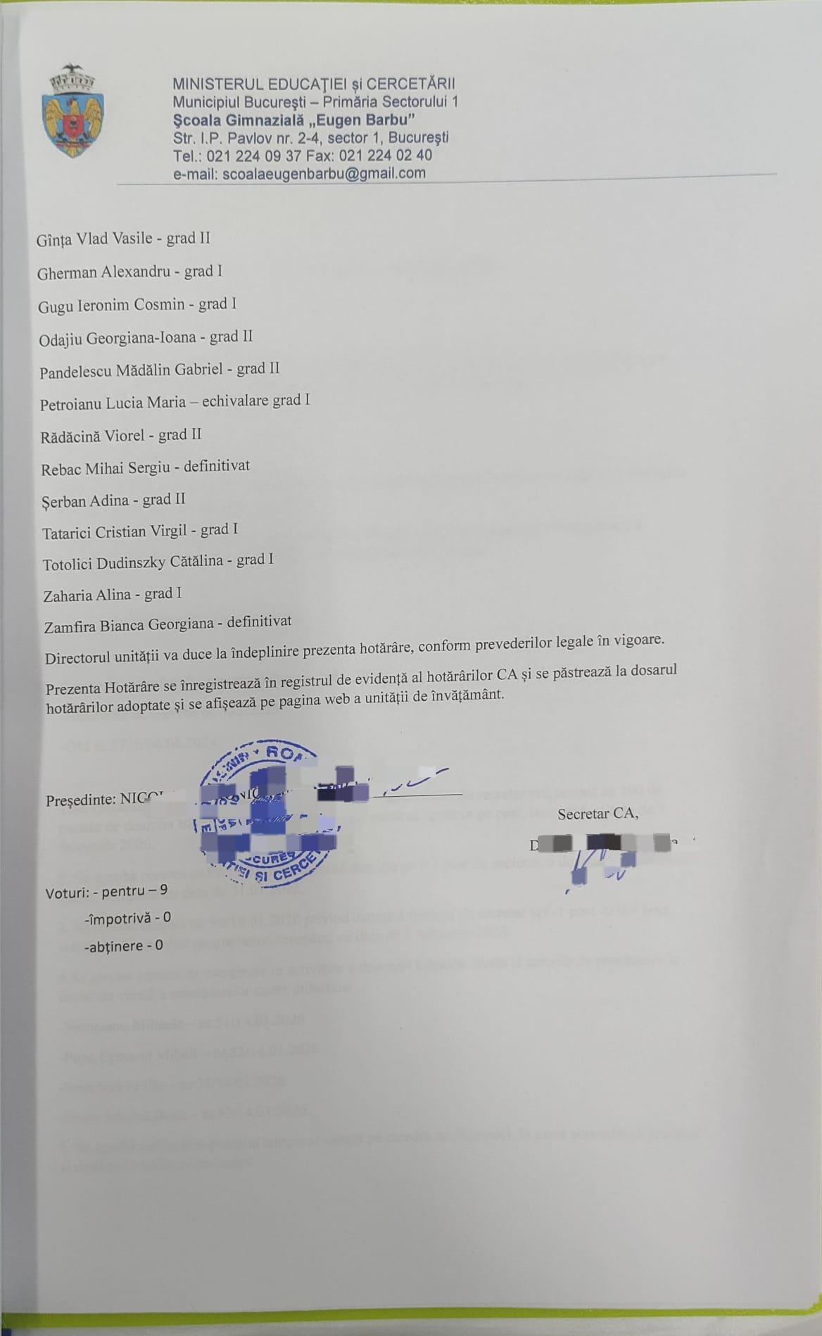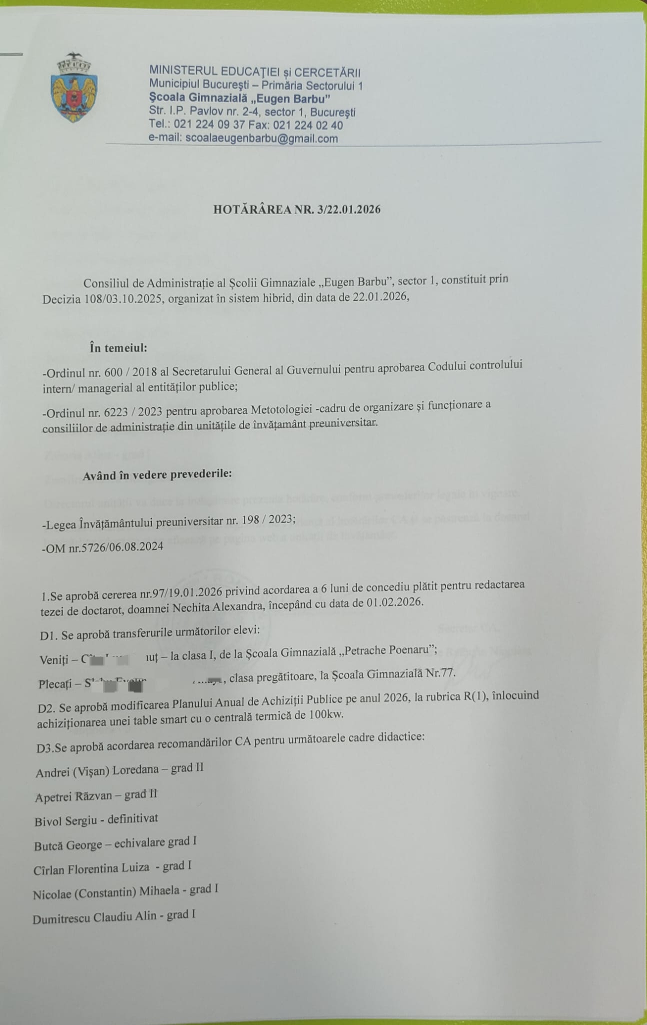 HOTARÂREA NR. 3/22.01.2026 Consiliul de Administrație al Școlii Gimnaziale ”Eugen Barbu”, sector 1, constituit prin Decizia nr. 108/03.10.2025, organizat în sistem hibrid, din data de 22.01.2026,