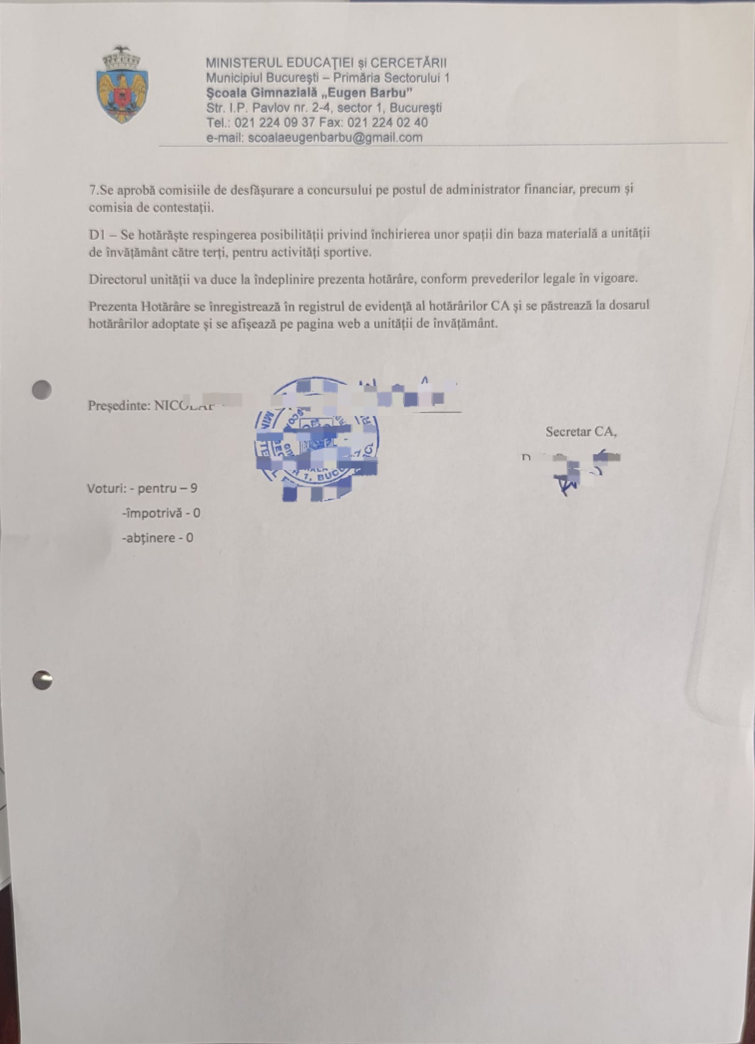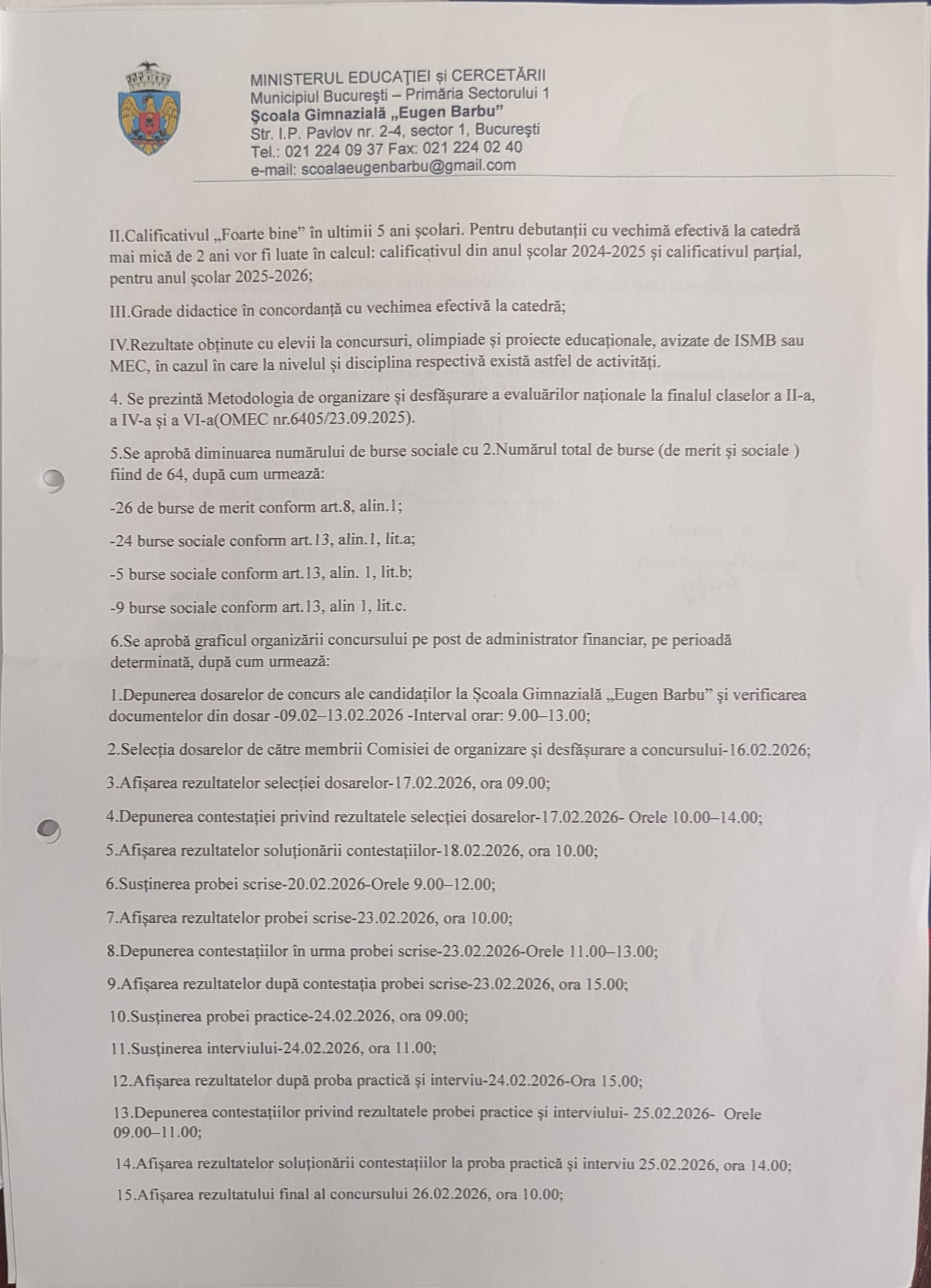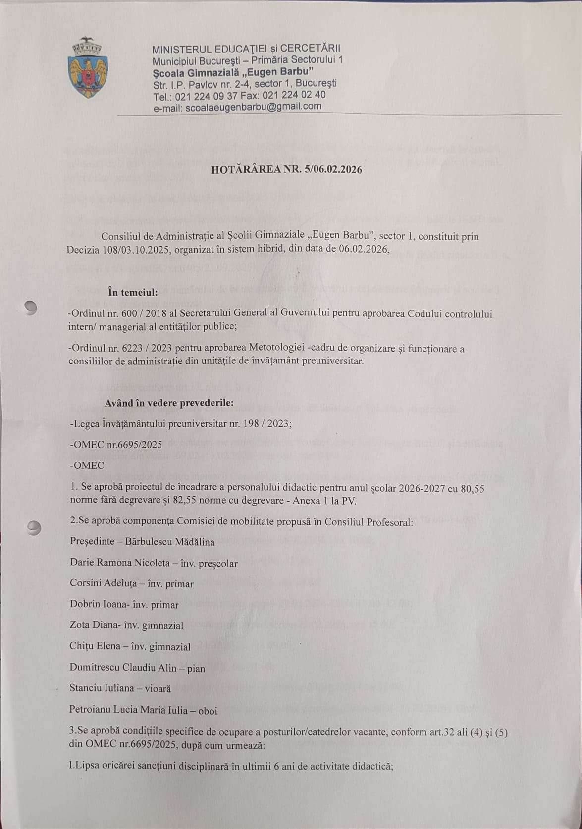 HOTARÂREA NR. 5/06.02.2026 Consiliul de Administrație al Școlii Gimnaziale ”Eugen Barbu”, sector 1, constituit prin Decizia nr. 108/03.10.2025, organizat în sistem hibrid, din data de 06.02.2026,